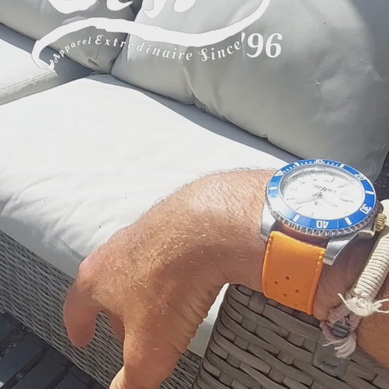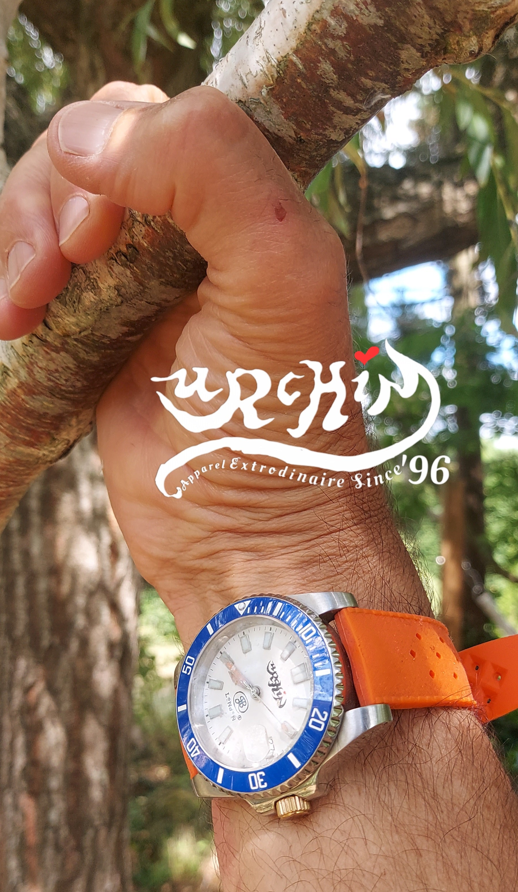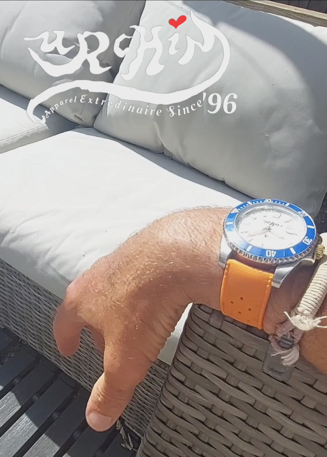 URCHIN Accessories & Watches. Limited Edition 'OYSTER DIVER' Blue & White 'Urchin London' Logo Watch. Orange Rubber Strap. *To Order only.