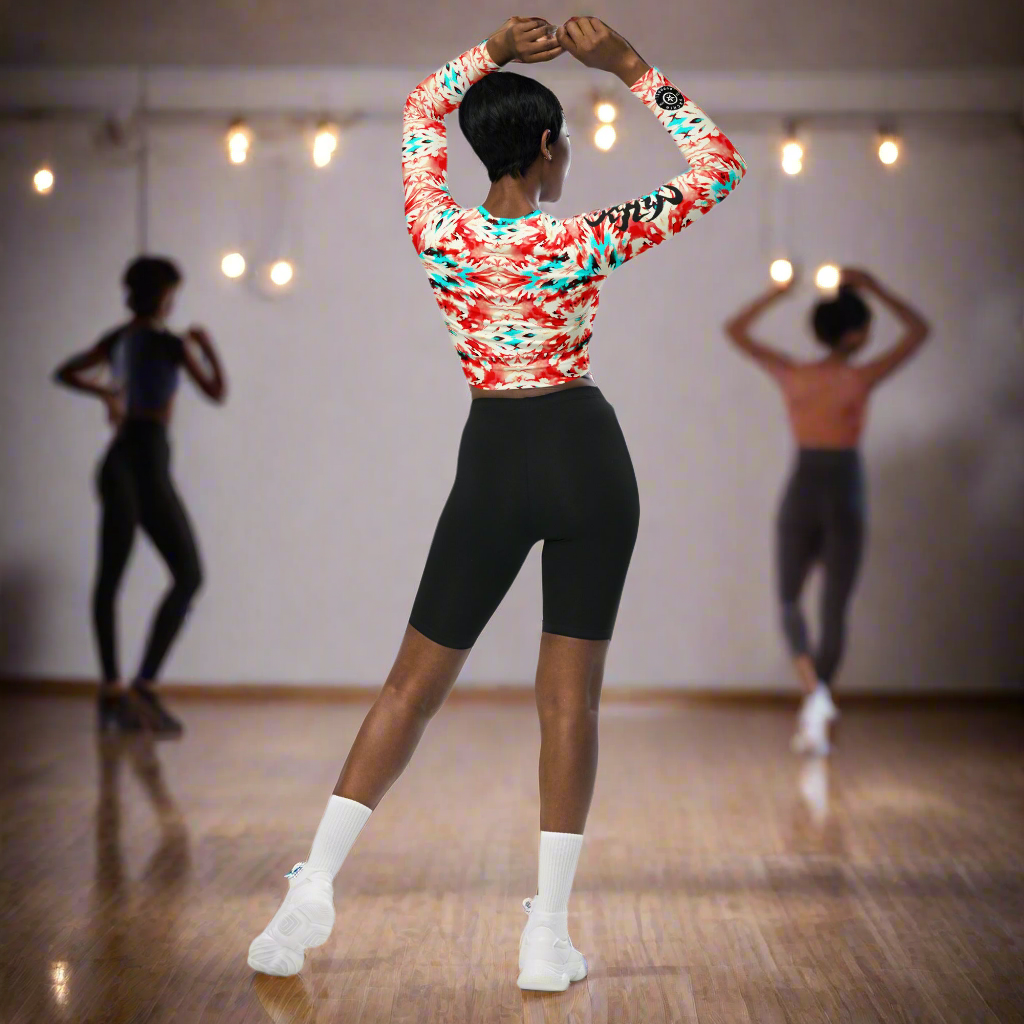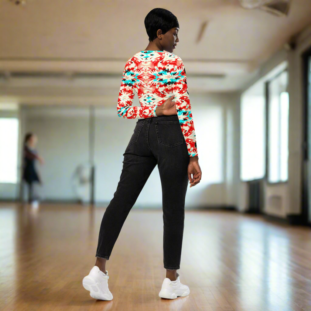 URCHIN Clothes & Sportswear 'CORAL SEA' Red and Blue Tie Dye Womens Recycled Long Sleeve Crop Top. Choice of Sizes.