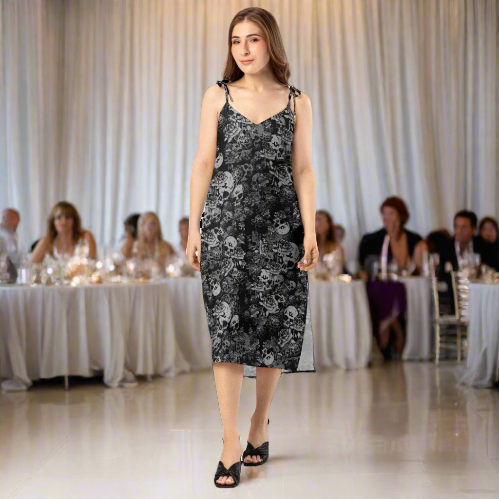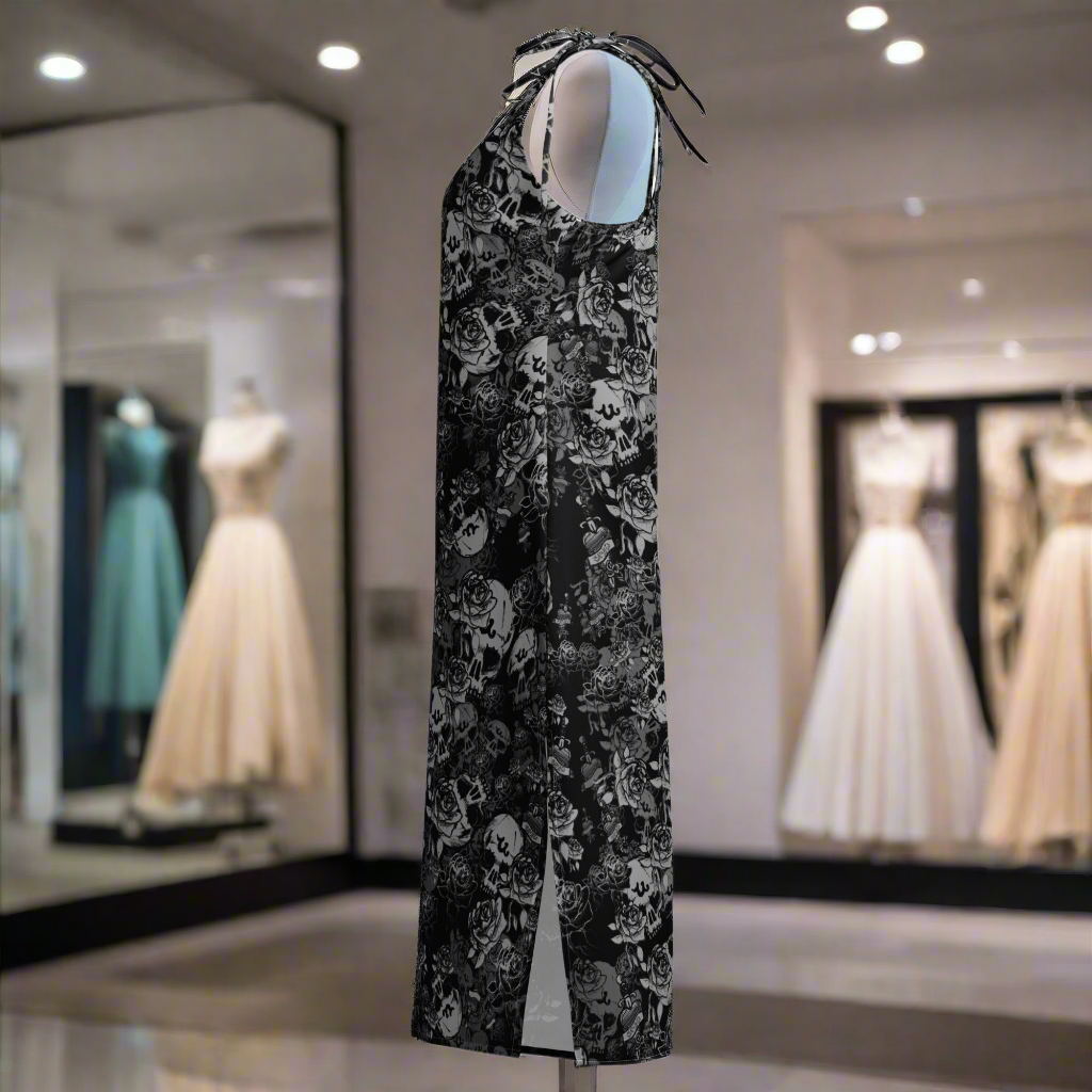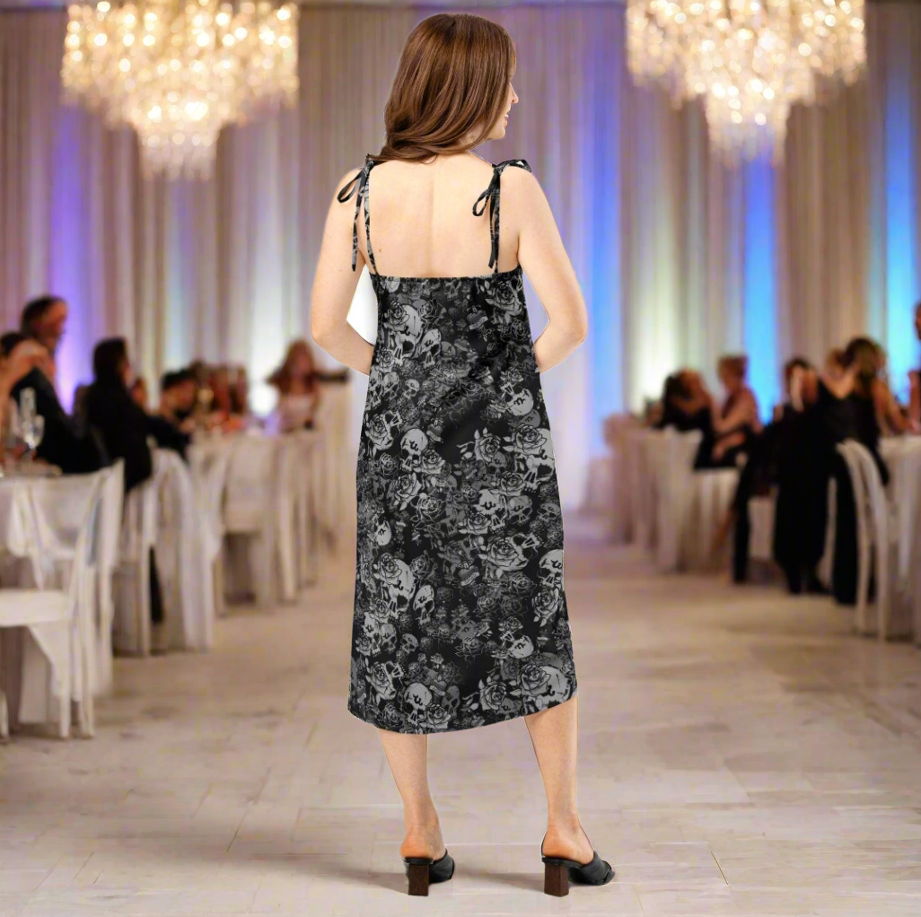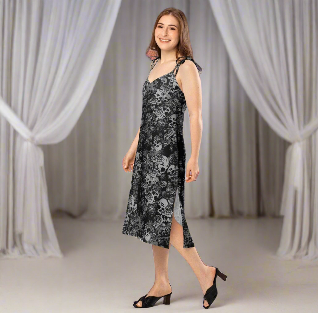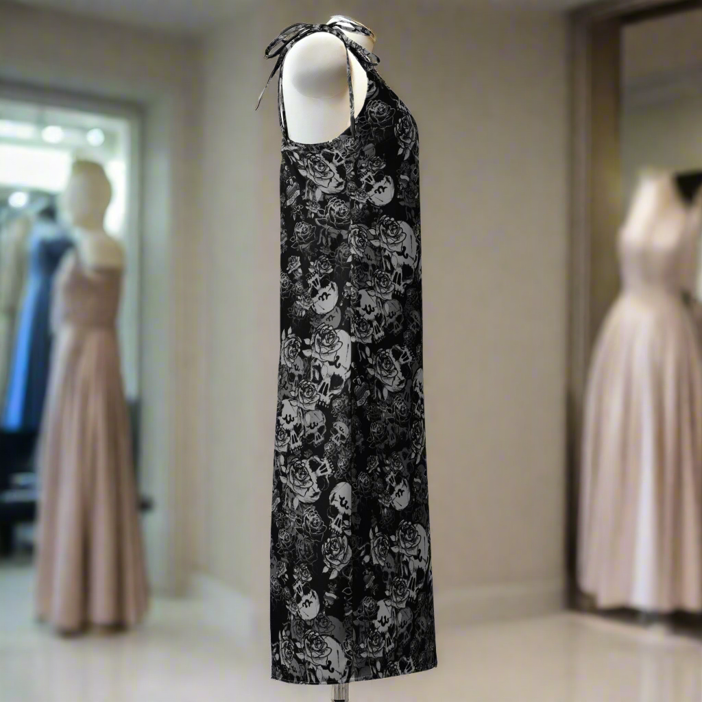 DARK URCHIN-'U Skull Storm' Skulls, Hearts Daggers, & Roses Tattoo Design. Tie-strap midi dress. Colour 'Night' (Black) Choice of Sizes.