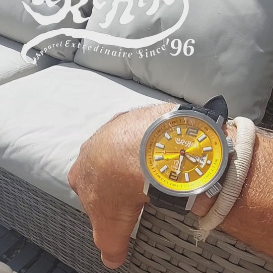 This iconic 'Retro Divers' Watch, comes with a Orange Face, Luminous Dial, and my 'Urchin' & 'JSP London' Logos. Topped with a Steel Bezel. Stainless Steel Body and Chunky Retro Rubber Strap with Steel Clasp/Pin Buckle. No plastic parts!
