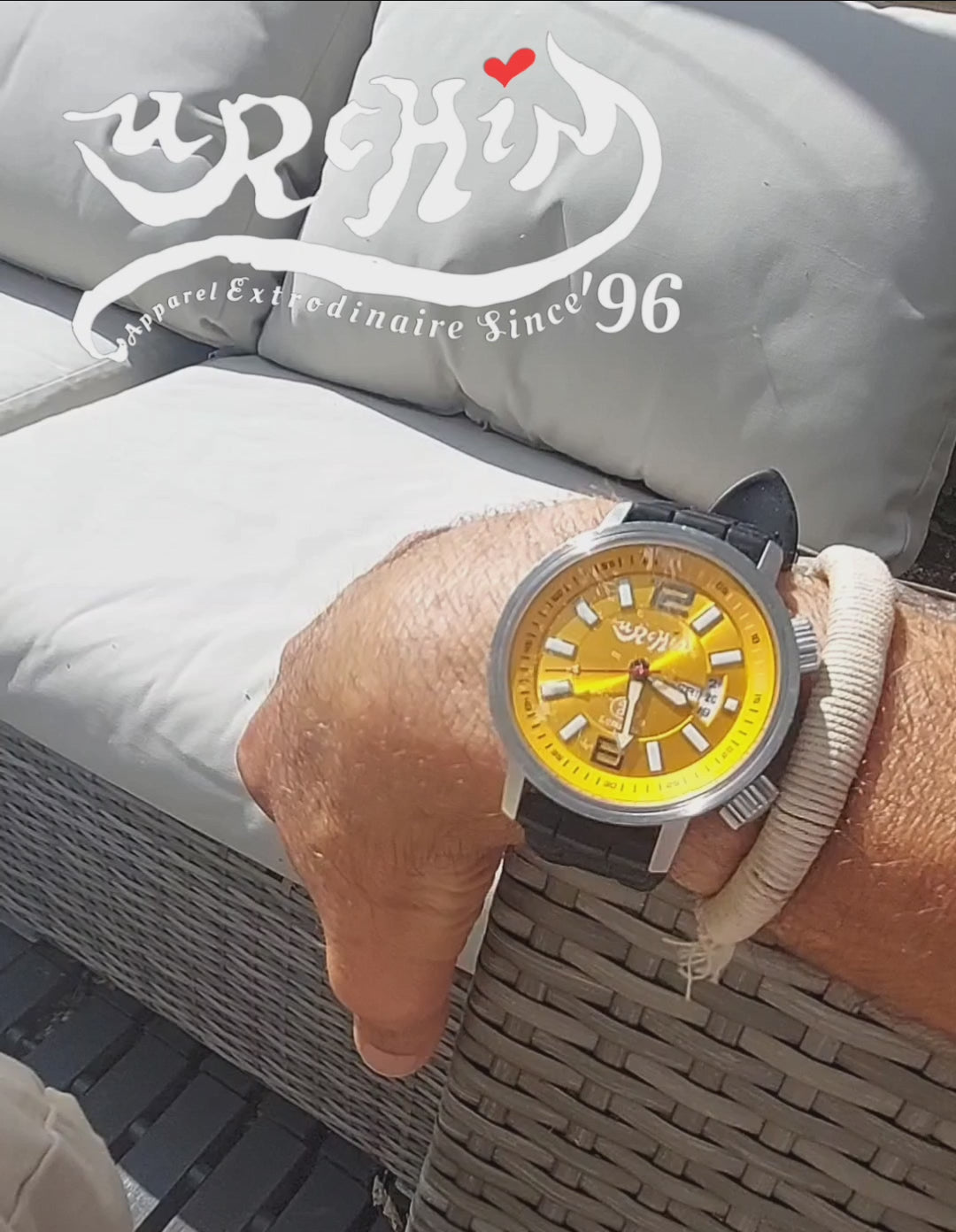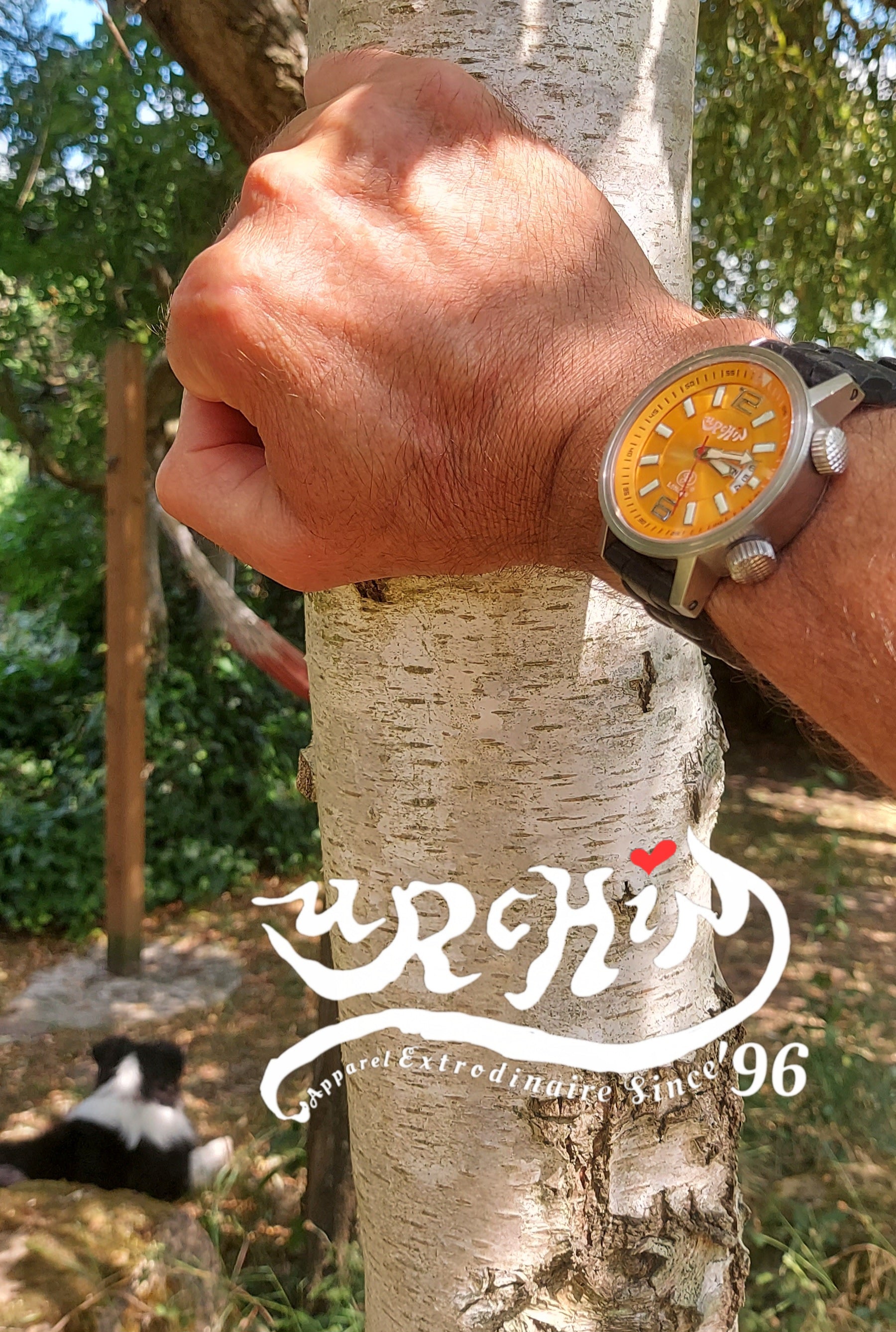 URCHIN Accessories & Watches. Orange 'RETRO DIVER' 'Urchin London' Logo Steel Watch. Rubber Strap. *To Order pnly.